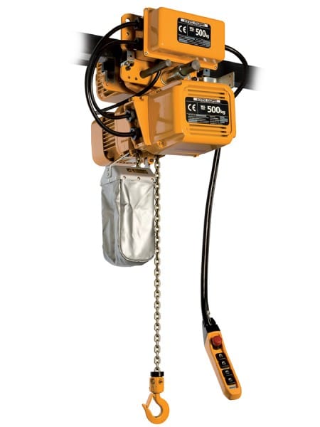 Equipped with overload protection (over 980 kg), reset, emergency stop and upper- and lower limit switches integradted in hoist body. Can also be delivered with chain bag/container, filter and lubricator.